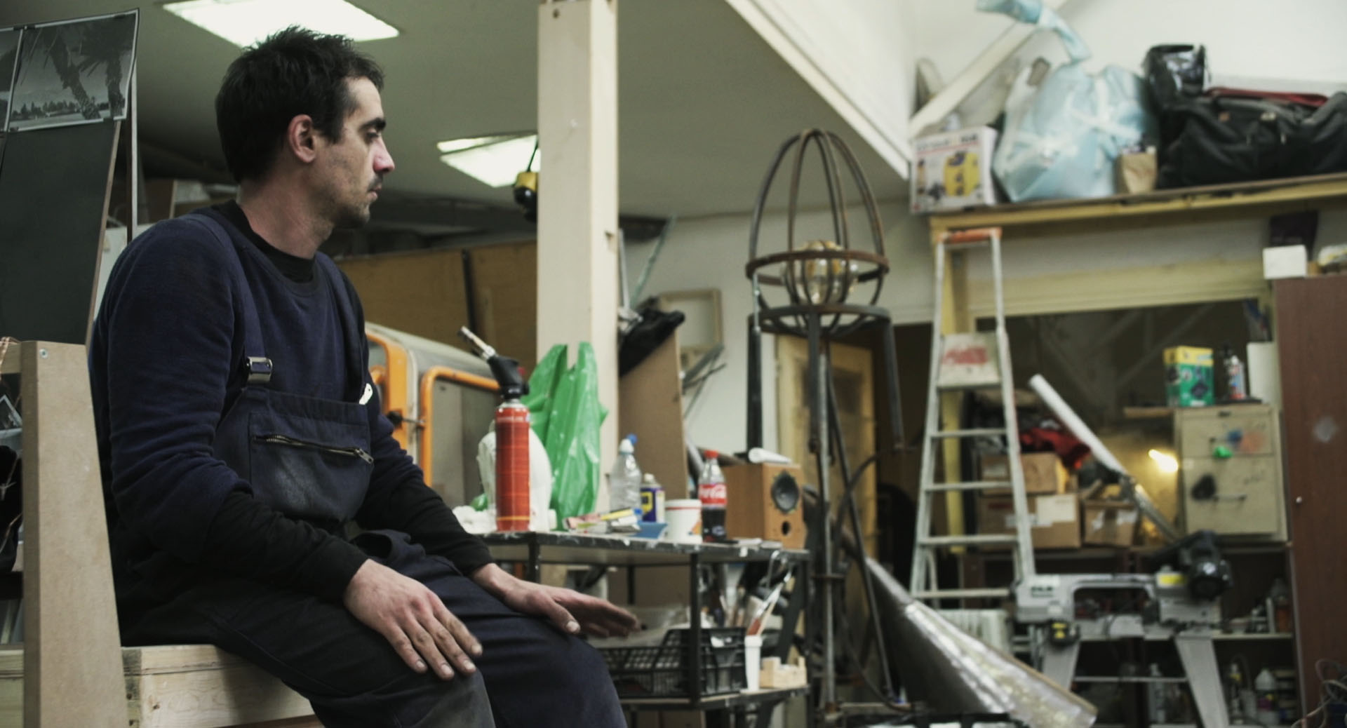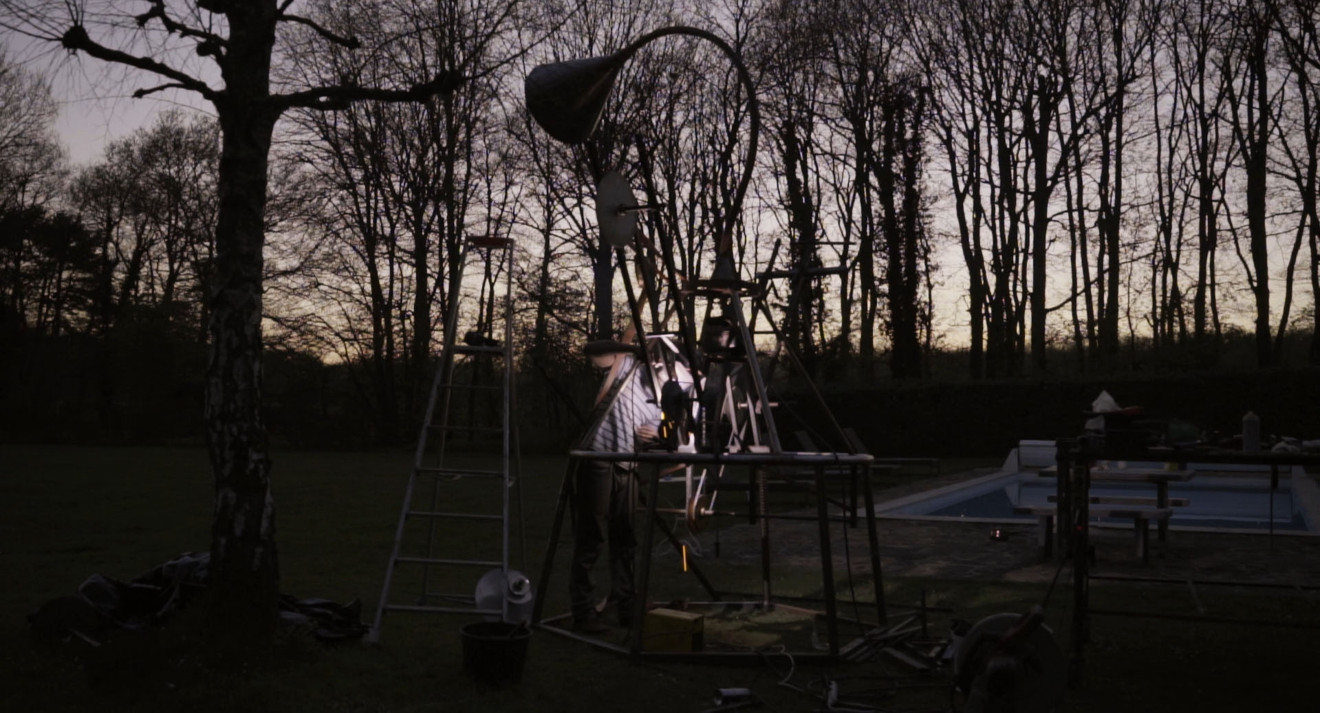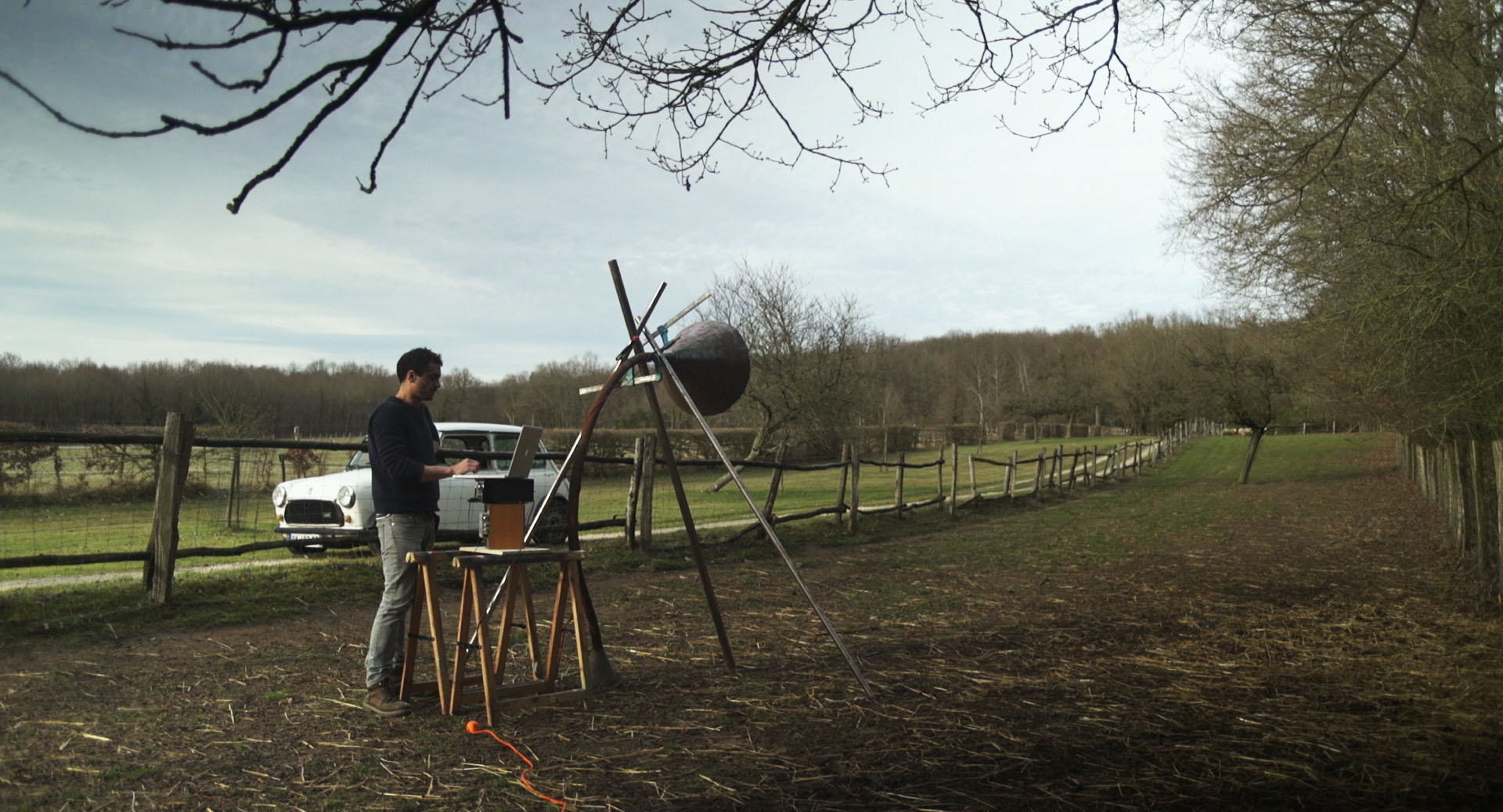 Dans son atelier ou dans la campagne, l’artiste-ouvrier construit, détruit et reconstruit ses sculptures pour donner vie à des machineries extravagantes.